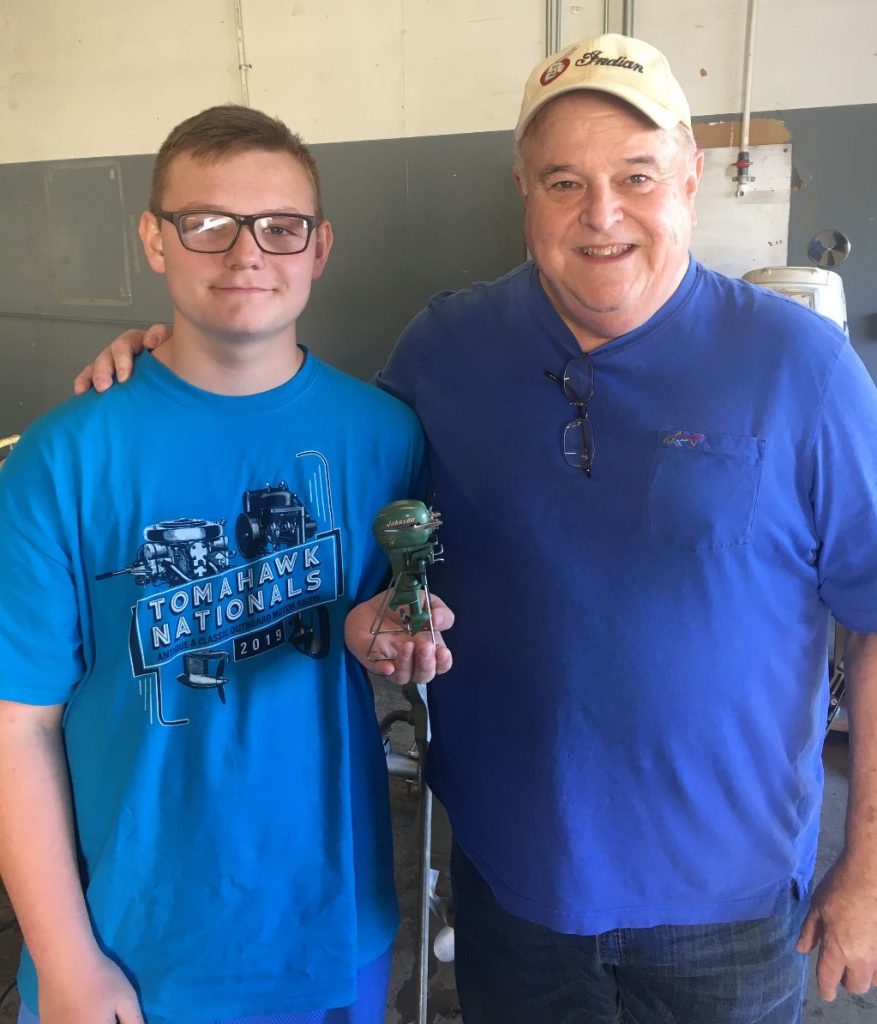 Tony and Andrea Robinson recently decided to adopt several children, and their future son, Max, decided to come with Tony to our meet. I saw Max looking at a lot of stuff, but never saw him talk Tony into buying anything. Then, I came up with an idea to resurrect George Jacob’s “nickel deal”. I approached Max and told him that I had a special deal for him if he had a nickel. Similar to mine and Mike’s deal with George years ago, someone handed Max a nickel. I took Max over to my vehicle and pulled out a special outboard motor that I thought would be perfect for him. It was a 5” tall K&O Models, Inc. replica of a 1954 Johnson 25HP outboard motor sitting on a replica stand as well. Max gave me his newly acquired nickel, and I gave him his new outboard motor. Hopefully he has it in his room now.