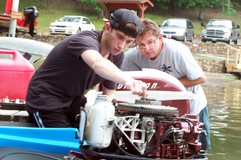 Carl Fryer and his son brought their boats including his Arkansas Traveler. Carl’s son’s 1957 Johnson 35 konked out on the lake and got towed back to the dock. He pulled the flywheel to do some trouble shooting. Ace mechanic Chip Rathbun discovered that the flywheel key had sheared. The key was replaced and he was back in business in short order.