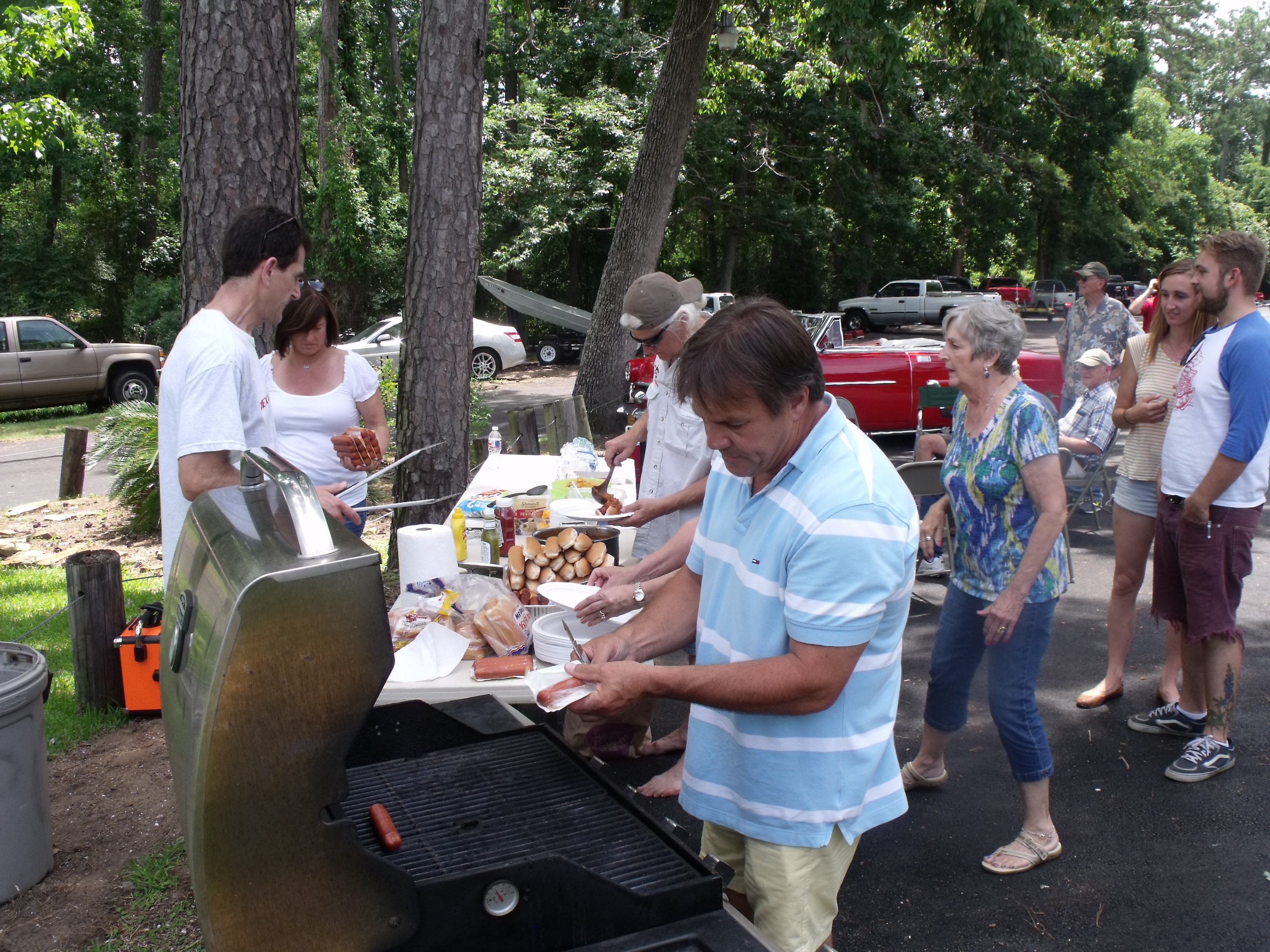 Adam and Suzie Finn assisted by Clinton Russell served up a tasty lunch of grilled jumbo hotdogs (FYI-Hebrew National) and Suzie Finn’s Excellent Chili. Other fixin’s included tater salad, watermelon, cookies and drinks.