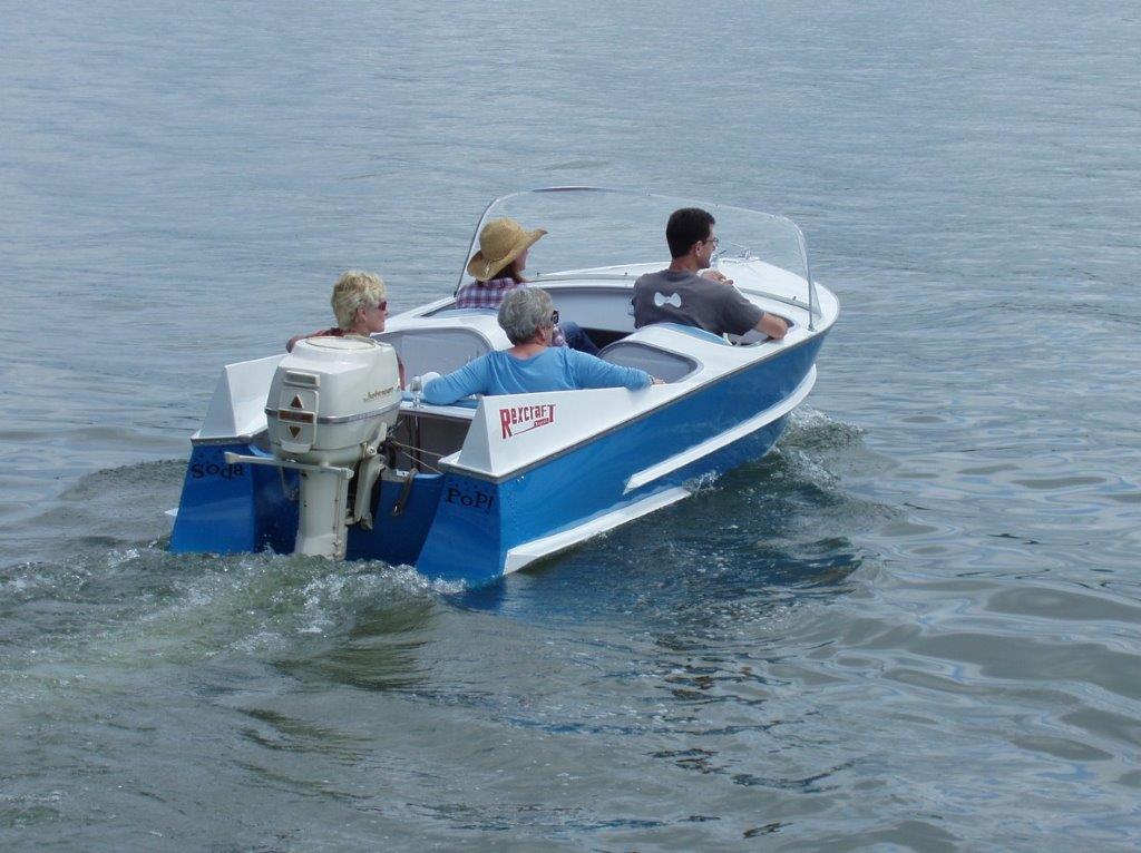 Adam Finn was giving tours in his nicely painted Rexcraft aluminum boat with its Johnson 35HP.